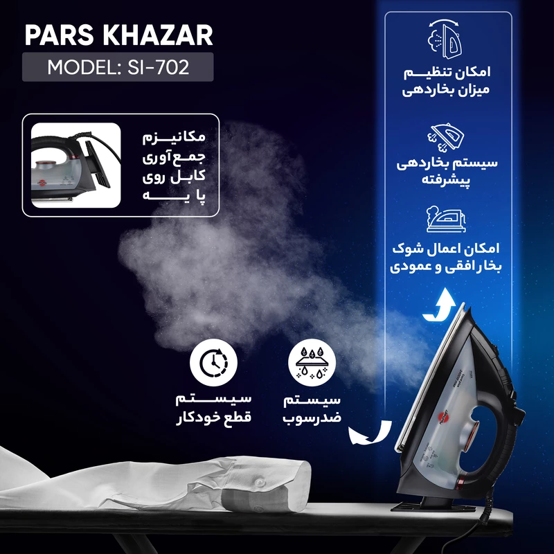 اتو بخار پارس خزر مدل SI-702 اتو بخار پارس خزر مدل SI-702 یک ابزار کاربردی برای اتو کردن لباسها است. این اتو دارای امکانات بخاردهی عمودی است که به شما امکان میدهد لباسها را به راحتی و با دقت بیشتری اتو کنید. همچنین، این اتو دارای ویژگی ضد فرسودگی است که باعث میشود مدت طولانیتری بتوانید از آن استفاده کنید. سیستم ضد رسوب این اتو هم از مزایای دیگر آن است که باعث میشود تا برای شما آسانتر باشد تا از این اتو استفاده کنید و همچنین تا از عمر طولانیتری برخوردار باشد.