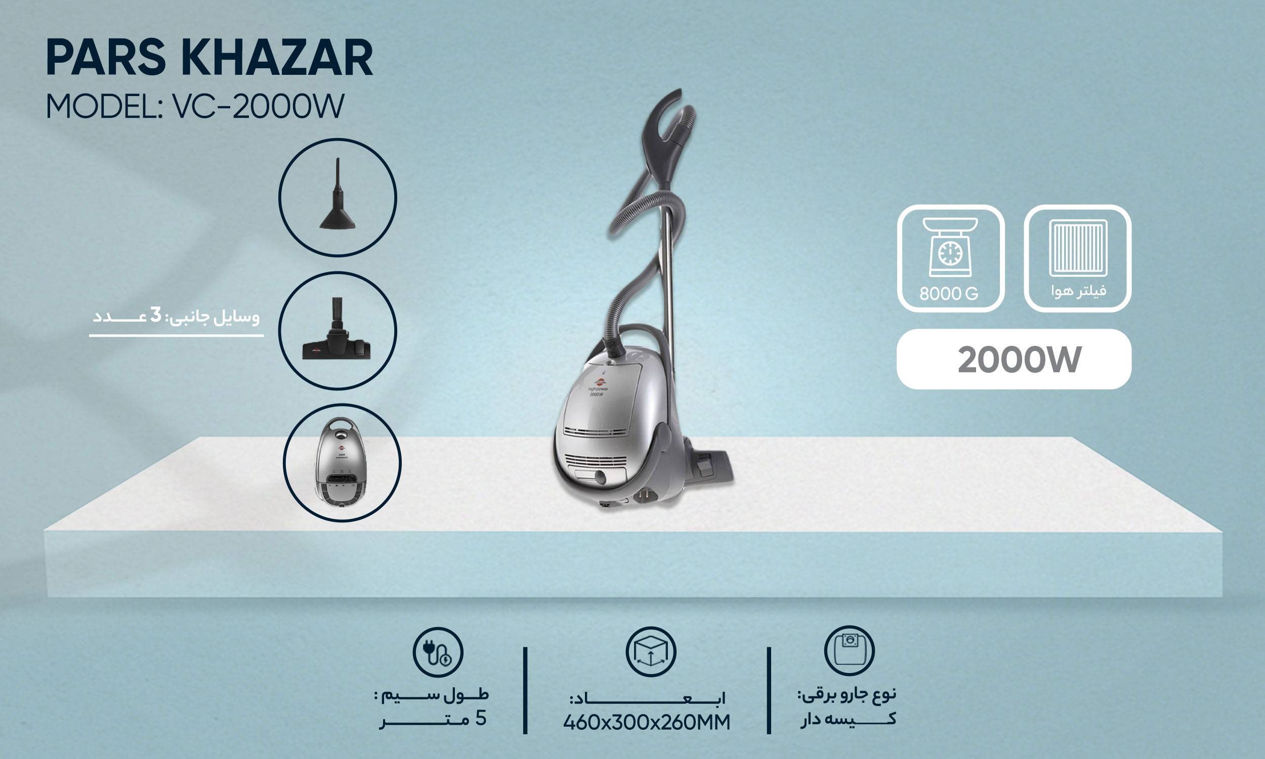 جارو برقی «پارس خزر» مدل «VC-2000W» از محصولات شرکت پارس‌خزر است که با طراحی زیبا و کم‌حجم و قدرت بالا تولید و عرضه شده است. این محصول بسیار جمع‌وجور بوده و با دستگیره متحرک و بزرگی طراحی شده که نه‌تنها حمل‌ونقل آن را آسان‌تر می‌سازد بلکه برای خاموش روشن هرچه راحت‌تر دستگاه هم مورد استفاده قرار می‌گیرد. بر روی بدنه دستگاه همچنین یک محفظه برای قرارگیری برس‌ها و سری‌های جارو طراحی شده که به سهولت استفاده از این جارو می‌افزاید.