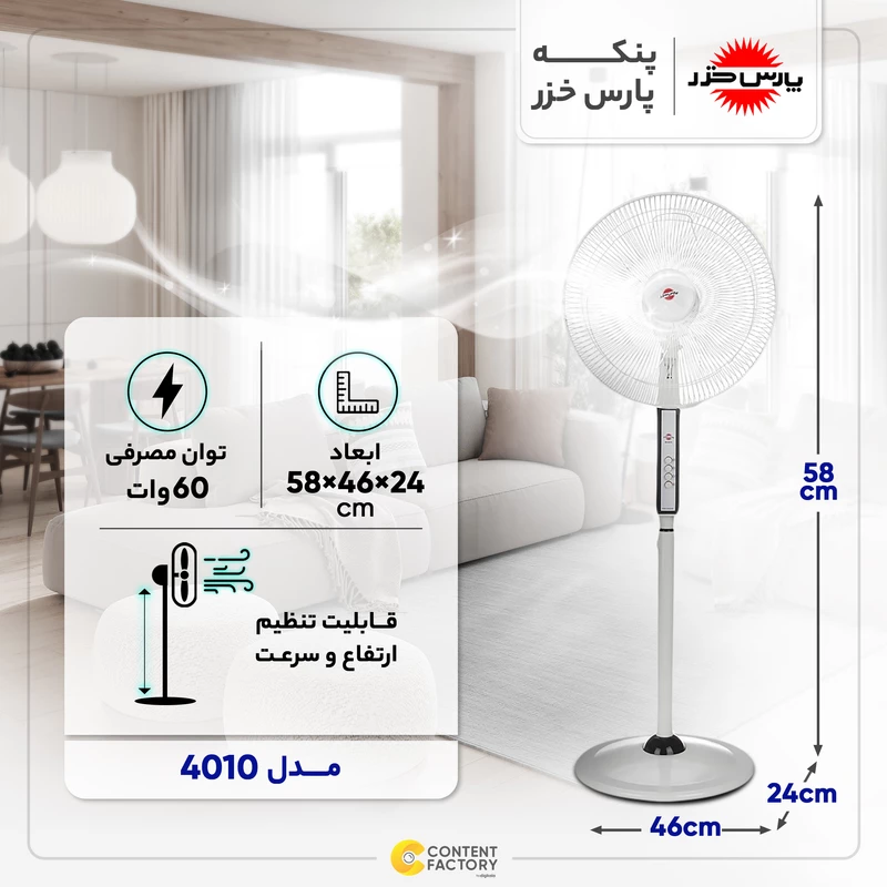 پنکه پارس خزر مدل 4010 کالایی از برند معتبر و خوشنام پارس خزر است که با ساختاری ایستاده به بازار عرضه شده است. قابلیت تنظیم ارتفاع تا 100 سانتیمتر یکی از کلیدیترین ویژگیهای این دستگاه کم صدا است که در کنار حجم باددهیای تا 56 متر مکعب در دقیقه میتواند محیطهایی با ابعاد زیر 100 متر را بهخوبی پوشش دهد. سرعت گردش پروانهها تا 1250 دور در دقیقه یکی دیگر از مشخصههای این محصول است که با وجود موتور 60 وات سوار شده بر روی سیستم امکانپذیر است. به طور کلی پنکهی پیش رو قابلیت تغییر سرعت در گردش پروانهها را هم دارد و میتواند در سه حالت تند، متوسط و کند تغییر سرعت دهد. البته این مدل فاقد تایمر قابل برنامهریزی و ریموت کنترل است و ساختار ظاهری آن شاید کمی قدیمی به نظر برسد. همچنین امکان گردش افقی یکی دیگر از مشخصات این دستگاه خانگی است که نسبت به پنکههایی با گردش تناوبی یک قدم عقبتر است. لازم به ذکر است که این نوع کالای ایستاده قابلیت نصب و راهاندازی ساده و سریعی دارد و به شکل غیر مونتاژ به بازار ارائه شده است.