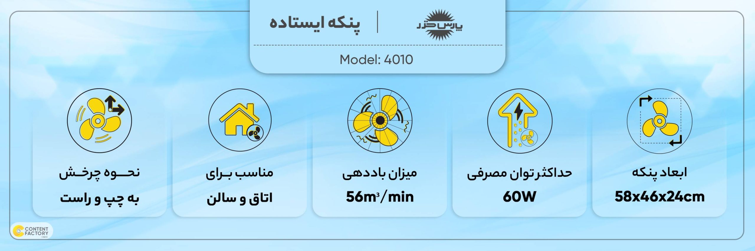 این مدل پنکهی پارس خزر وزنی در حدود 7.5 کیلوگرم دارد. این وزن بالا میتواند از نقطه نظر ثبات در زمان کارکرد سیستم بااهمیت باشد، چرا که پنکهای سنگین با پایهای محکم میتواند تعادل دستگاه را در زمان کار به خوبی حفظ کند. همچنین بدنهی این محصول ترکیبی از استیل و پلاستیک ضد ضربه است. به همین دلیل هم جزو کالاهای مقاوم به شمار میرود. از آنجایی که این محصول برای استفاده در اتاقهایی با متراژ زیر 100 متر طراحی شده است موتور 60 وات روی آن میتواند در بحثگردش هوای محیط به شکلی قدرتمند دخیل باشد. پنکه پارس خزر مدل 4010 حجم باددهیای به اندازهی 56 متر مکعب در دقیقه دارد و سرعت گردش پروانههای آن میتواند به چیزی در حدود 1250 دور در دقیقه برسد. کالای ایستادهی پیش رو از تایمر برای خاموشی خودکار و ریموت کنترل برای راحتی در استفاده از پنکه برخوردار نیست. بنابراین ممکن است برای برخی از افراد خرید چنین کالایی چندان ایدئال نباشد. با خرید این محصول میتوانید ارتفاع آن را تا 100 سانتیمتر تغییر دهید. همچنین سرعت این پنکه در سه حالت کند، متوسط و تند قابلی کنترل و تغییر است. پنکه پارس خزر مدل 4010 کالایی به صرفه، کم صدا و کم مصرف است که از امکان تغییر سرعت و ارتفاع برخوردار است. این محصول سرمایشی امکان باددهی تا 56 متر مکعب در دقیقه را دارد و پروانههای آن امکان چرخش تا 1250 دور در دقیقه را دارد. لازم به ذکر است این پنکهی ایستاده دارای کنترل از راه دور، تایمر و نمایشگر دیجیتال نیست و در کنار آن از امکان چرخش سری به شکل عمودی و سینوسی بیبهره است. همچنین کلیهی قطعات این محصول به شکل جدا جدا به بازار عرضه شده است و خریدار خود باید پنکه را مونتاژ کند که فرآیندی بسیار ساده و راحت است.